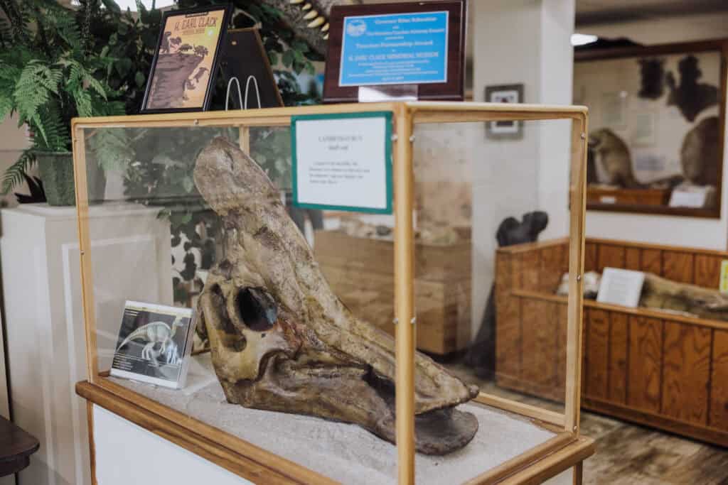 The museum also has a large skull cast of a Lambeosaurus, the largest of the duckbills, which was common in the area.
