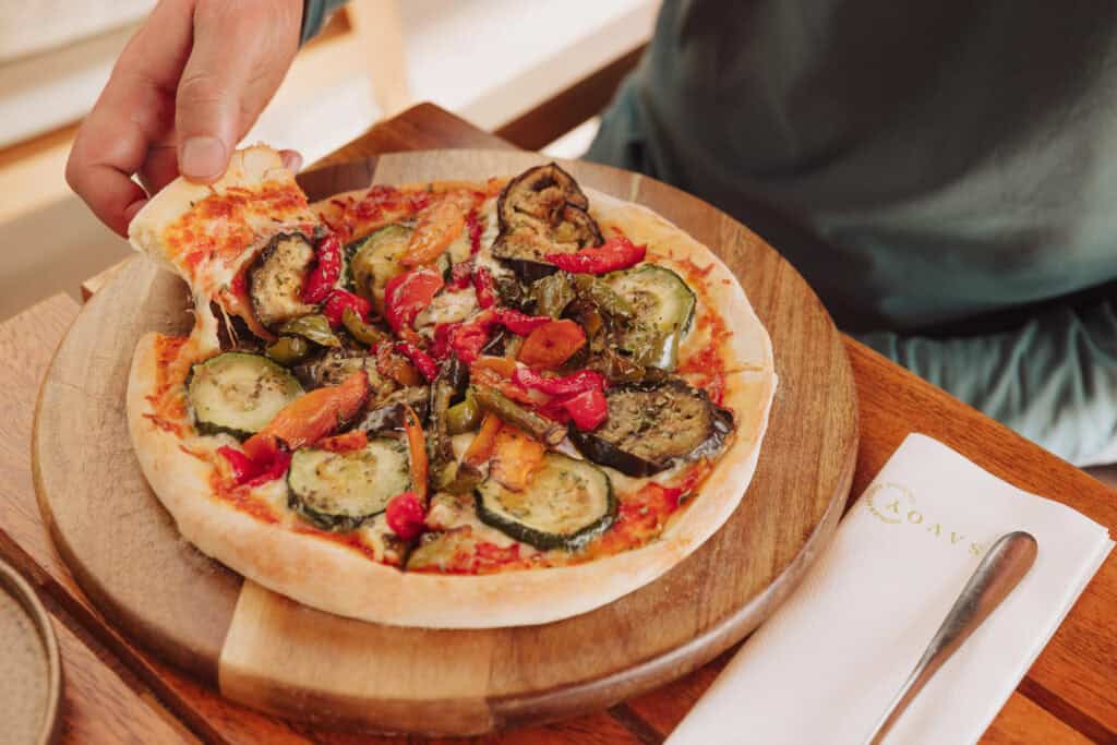 The sandwiches and pizzas also feature food from the garden, like this veggie-loaded Pizza de Horta.