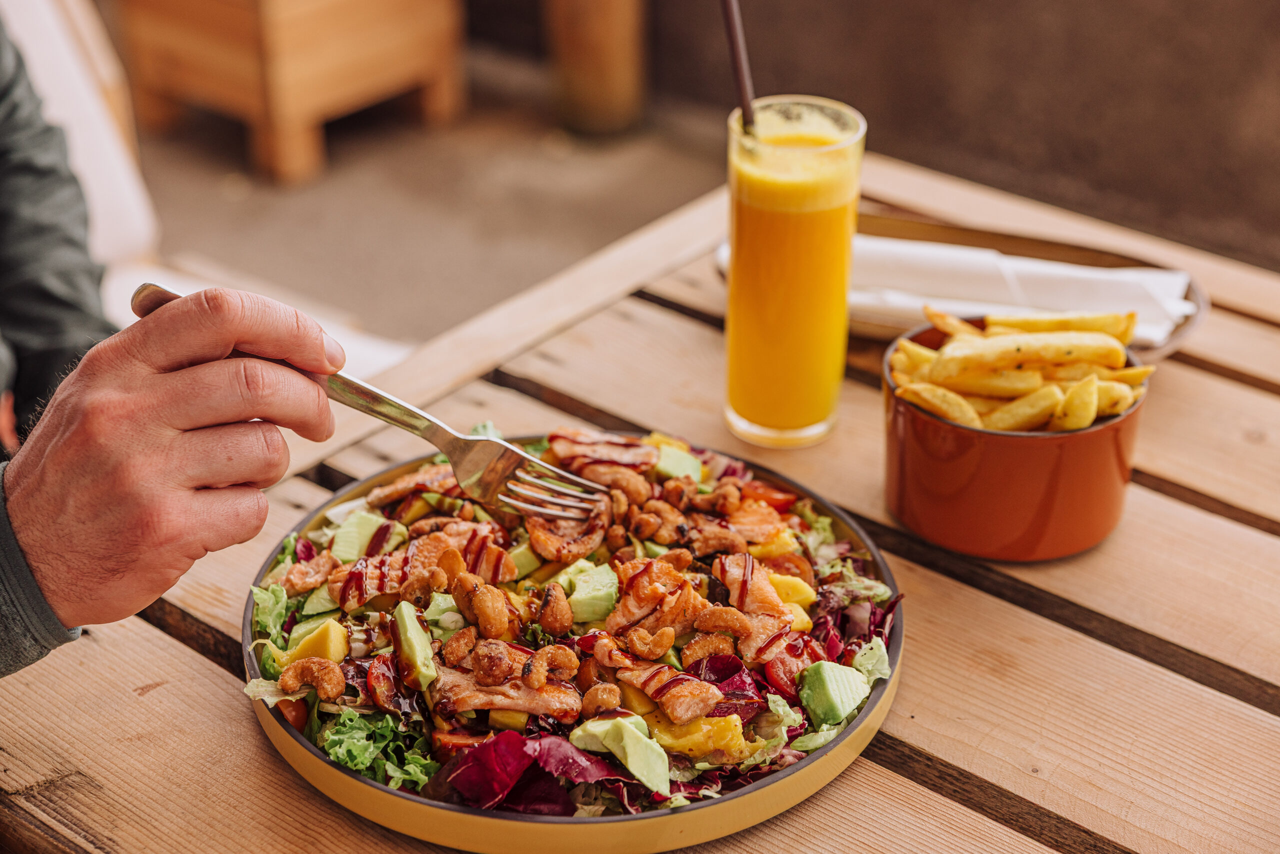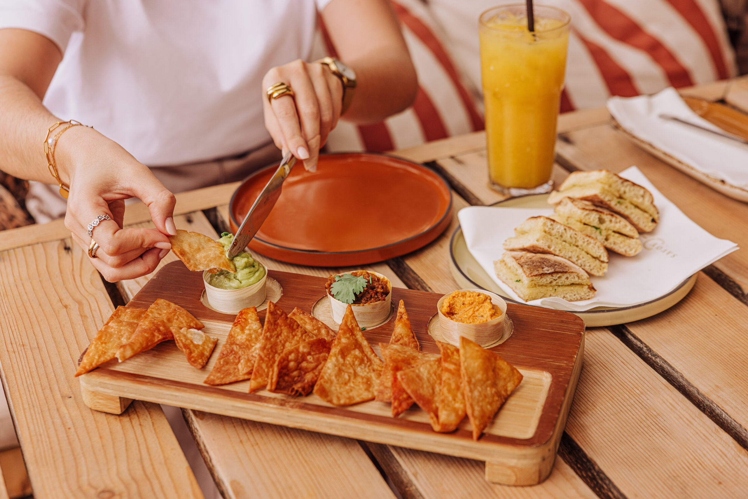 It’s a casual, rooftop restaurant at Saccharum, which overlooks the pool and the ocean. The meal options are fresh and delicious!