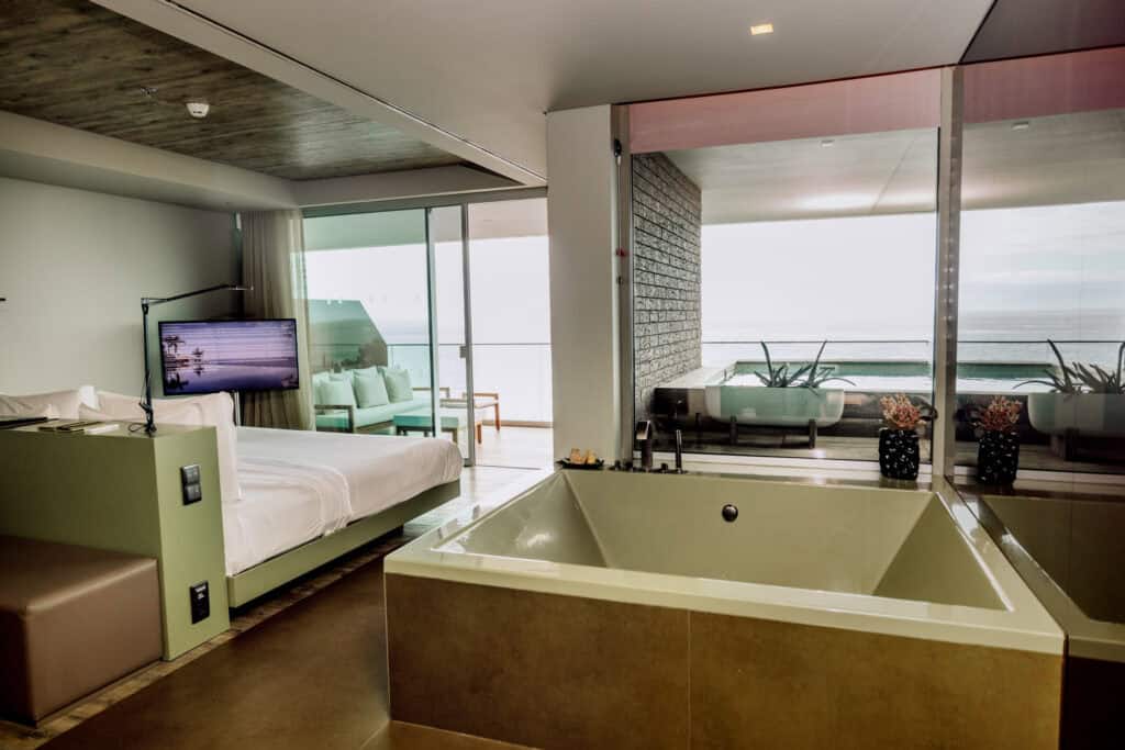 Right away, I was struck by how calming the whole place felt. The architecture has this cool industrial-meets-coastal vibe, which is softened by tropical plants and thoughtful design touches throughout the property. We stayed there on a springtime trip to Madeira during April and May.
