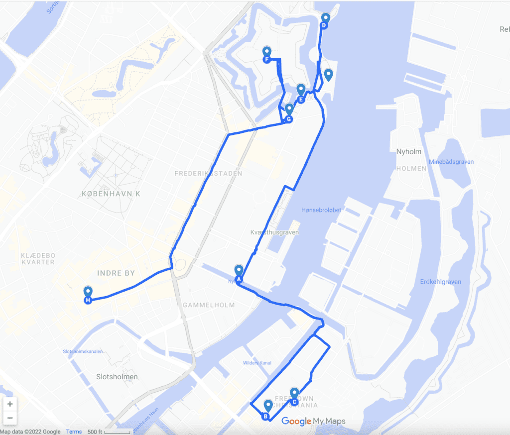 This is the path I’d follow, to hit most of the big sites in Copenhagen in a single day. The letters correspond to the letters on the map below:
